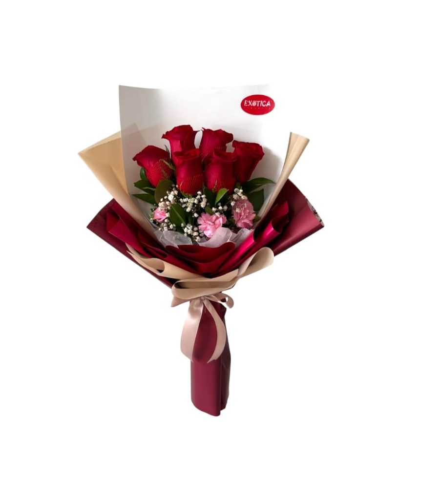 Ramo de 6 rosas decoradas con flores y follajes de complemento envueltas en papel coreano.
