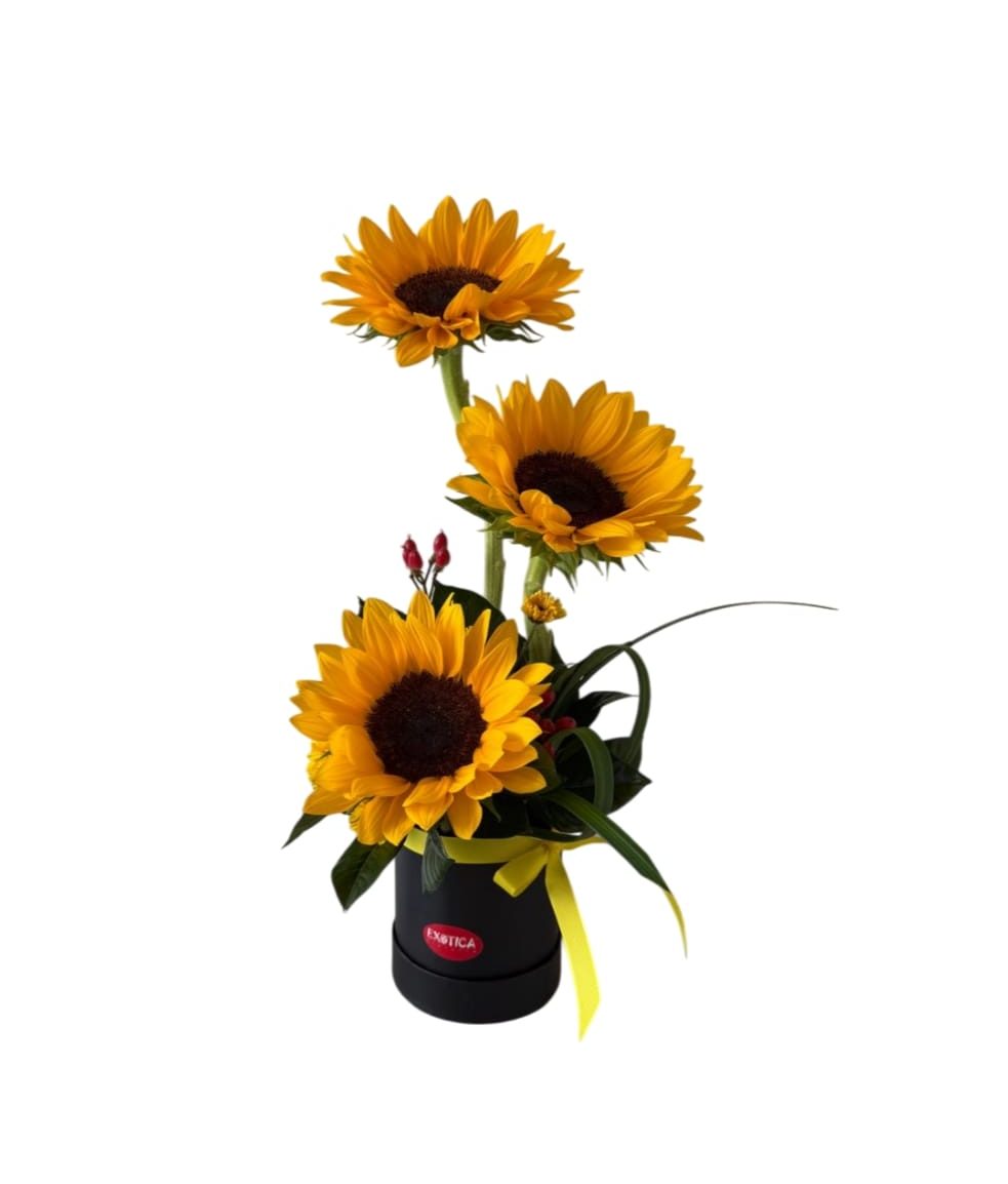 Arreglo de 3 girasoles más complementos variados preparado en base.